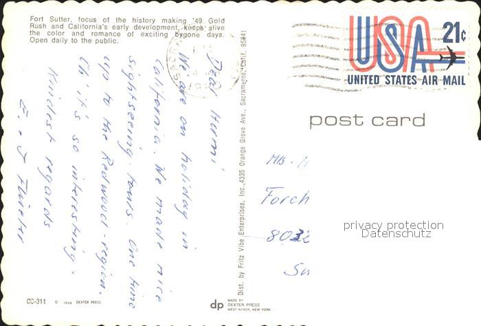 72239851 old postcard Sacramento California Fort Sutter Fliegeraufnahme postalisch gelaufen Erhaltung siehe scans KatCode: 14140050000000