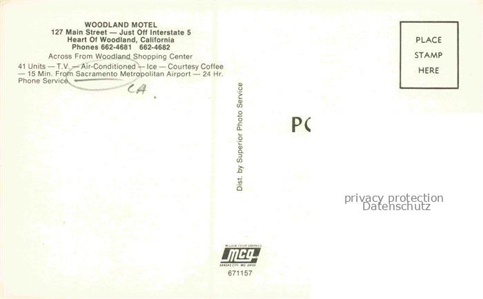 74123767 Sacramento California USA Woodland Motel postalisch nicht gelaufen Erhaltung siehe scans [FriedD77] KatCode: 14140050000000