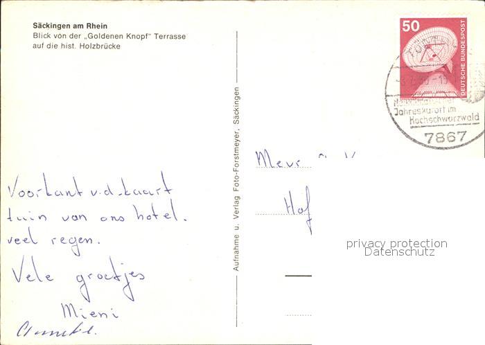 72493803 alte Postkarte Saeckingen Rhein Blick von der Goldenen Knopf Terrasse Historische Holzbruecke postalisch gelaufen Erhaltung siehe scans KatCode: 11110008337096