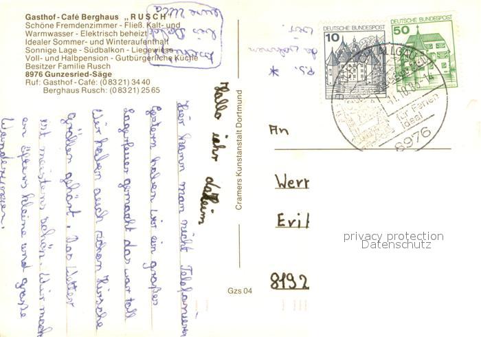 73660584 alte Postkarte Saege Gunzesried Gasthof Cafe Berghaus Rusch Restaurant Hirsch Wild in der Abendsonne Alpen postalisch gelaufen Erhaltung siehe scans [FriedD77] KatCode: 11110009780115