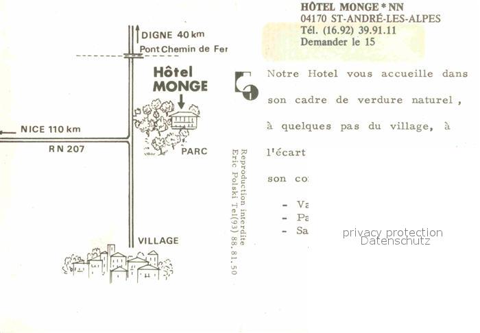 12893971 Saint-Andre-les-Alpes Hotel Monge Fernsehraum Doppelzimmer Garten postalisch nicht gelaufen Erhaltung siehe scans [AndreD76] KatCode: 11170004204173