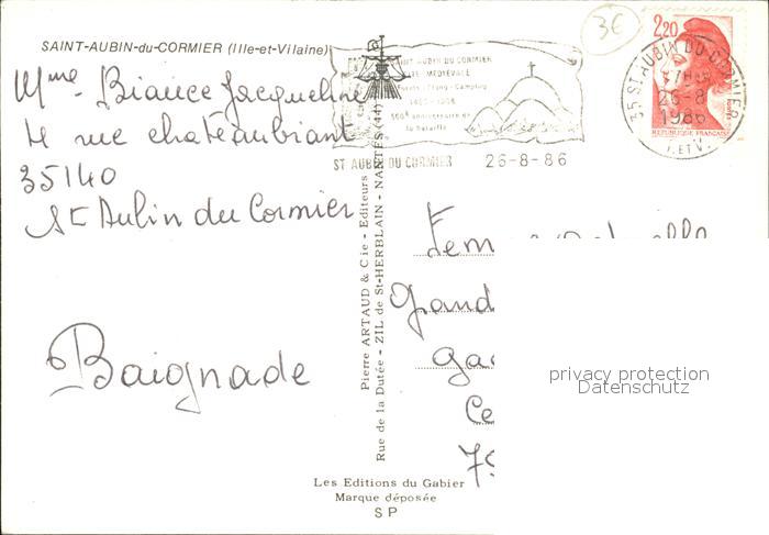 12207433 carte postale Saint-Aubin-du-Cormier Vue aerienne Les Ruines du Chateau l’entree du Camp la vieille Tour et l’Eglise Rocher de la lande de la rencontre postalisch gelaufen Erhaltung siehe scans KatCode: 11170035135253