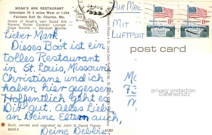 72794117 old postcard Saint Charles Missouri Noahs Ark Restaurant postalisch gelaufen Erhaltung siehe scans [LiesaD40] KatCode: 14140270000000