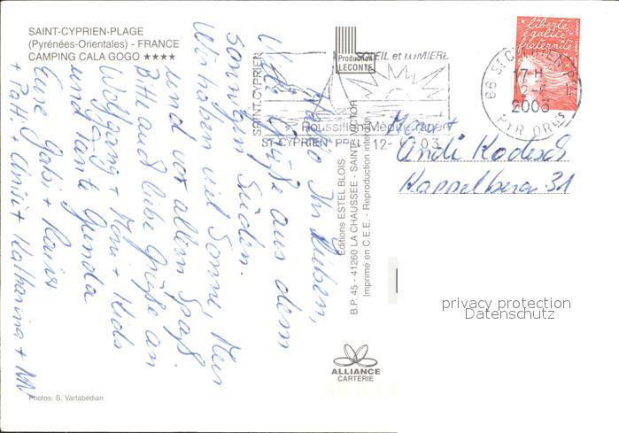 12034453 carte postale Saint-Cyprien Plage Camping Cala Gogo postalisch gelaufen Erhaltung siehe scans KatCode: 11170066266171