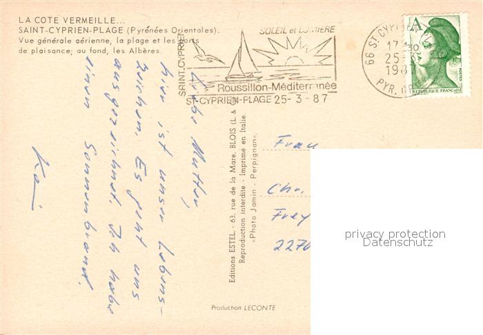 13152188 carte postale Saint-Cyprien Plage Fliegeraufnahme Strand Hafen Hotels postalisch gelaufen Erhaltung siehe scans [KathaD81] KatCode: 11170066266171