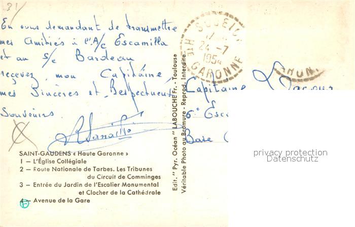13744532 Saint-Gaudens Eglise Collegiale Route Nationale de Tarbes Entree du Jardin de l’Escalier Monumental et Clocher de la Cathedrale Avenue de la Gare postalisch gelaufen Erhaltung siehe scans [WerneD78] carte postale Wern Katcode 11170031231483