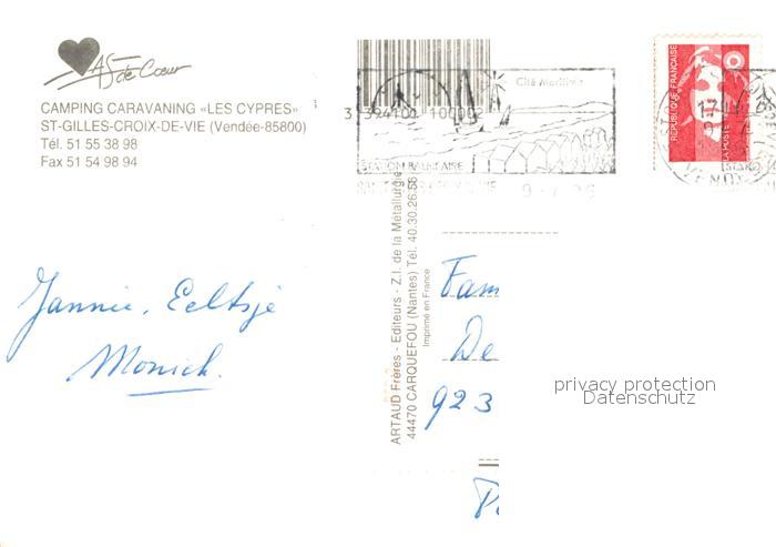 13224145 carte postale Saint-Gilles-Croix-de-Vie Vendee Camping Caravaning Les Cypres Piscine Plage postalisch gelaufen Erhaltung siehe scans [FriedD77] KatCode: 11170085385222
