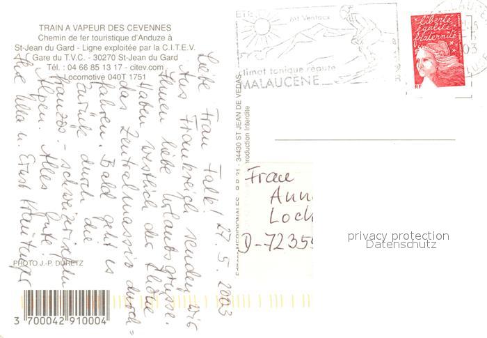 13171308 carte postale Saint-Jean-du-Gard Train a vapeur des Cevennes Dampflokomotive postalisch gelaufen Erhaltung siehe scans [FriedD77] KatCode: 11170030130269
