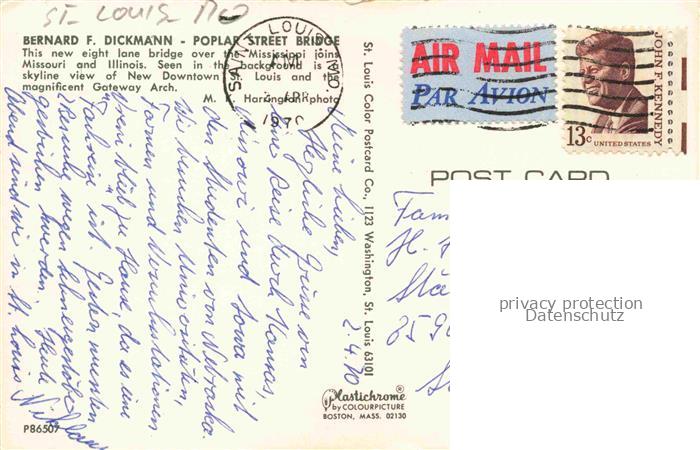 74132602 old postcard Saint-Louis Missouri (MO) USA Bernard F. Dickmann Poplar Street Bridge postalisch gelaufen Erhaltung siehe scans [FriedD77] KatCode: 14140