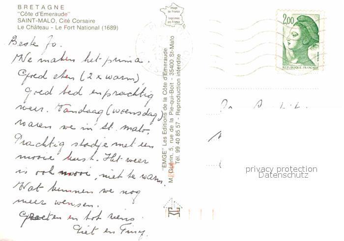 12838513 carte postale Saint-Malo 35 Chateau Fort National postalisch gelaufen Erhaltung siehe scans [FriedD77] KatCode: 11170035435288