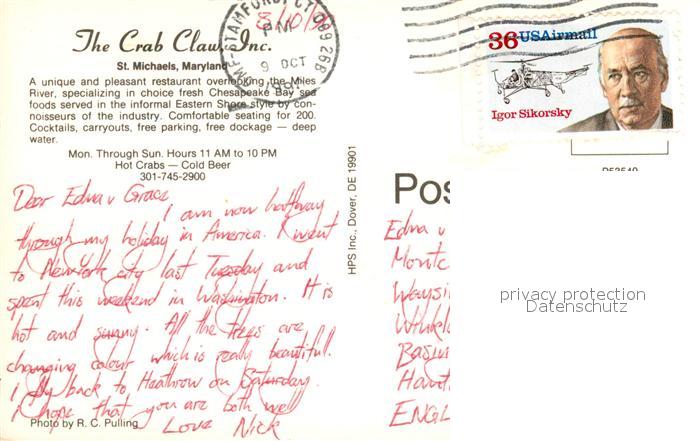 73131792 old postcard Saint Michaels Maryland The Crab Claw Restaurant Miles River Motorboat postalisch gelaufen Erhaltung siehe scans [FriedD77] KatCode: 14140220000000