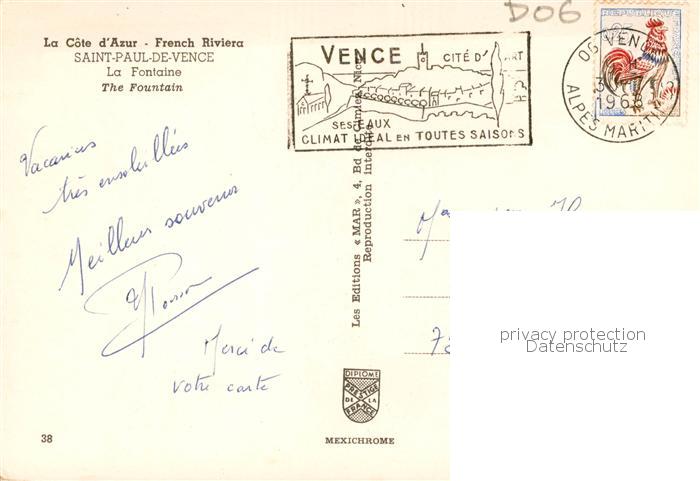 13846713 Saint-Paul-de-Vence 06 Alpes-Maritimes La Fontaine postalisch gelaufen Erhaltung siehe scans [FriedD77] carte postale Frie Katcode 11170006106044