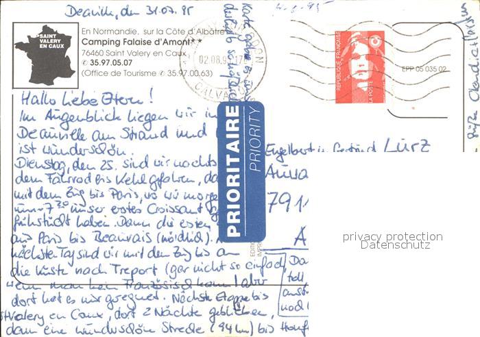 12039966 carte postale Saint-Valery-en-Caux Camping Municipal Falaise d Amont Strand Felsenkueste postalisch gelaufen Erhaltung siehe scans KatCode: 11170076176655