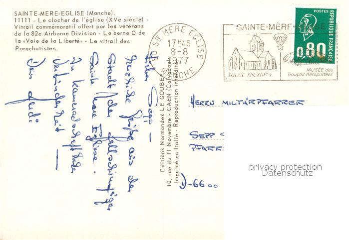 13797119 Sainte-Mere-Eglise Le clocher de l’eglise Vitrail commemoratif offert par les veterans de la 82e Airborne Division postalisch gelaufen Erhaltung siehe scans [WerneD78] carte postale Wern Katcode 11170050250523
