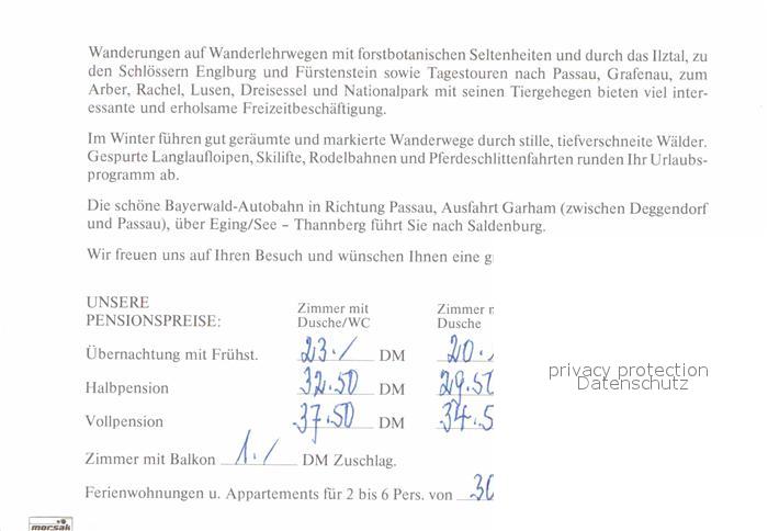 72916416 Saldenburg Pension Saldenburger Hof postalisch nicht gelaufen Werbekarte (keine Postkarte) Erhaltung siehe scans [LiesaD40] KatCode: 11110009272142