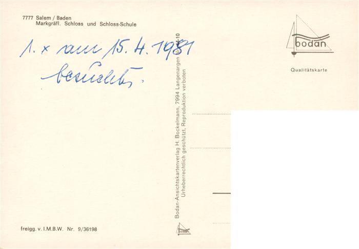 73885927 Salem Baden Markgraefl Schloss und Schloss Schule Fliegeraufnahme postalisch nicht gelaufen Erhaltung siehe scans [WerneD78] Wern Katcode 11110008435052