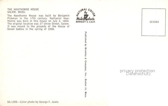 72944728 Salem Massachusetts The Hawthorne House postalisch nicht gelaufen Erhaltung siehe scans [WerneD78] KatCode: 14140230000000