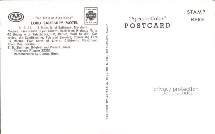 71859322 Salisbury Maryland Lord Salisbury Motel postalisch nicht gelaufen Erhaltung siehe scans KatCode: 14140220000000