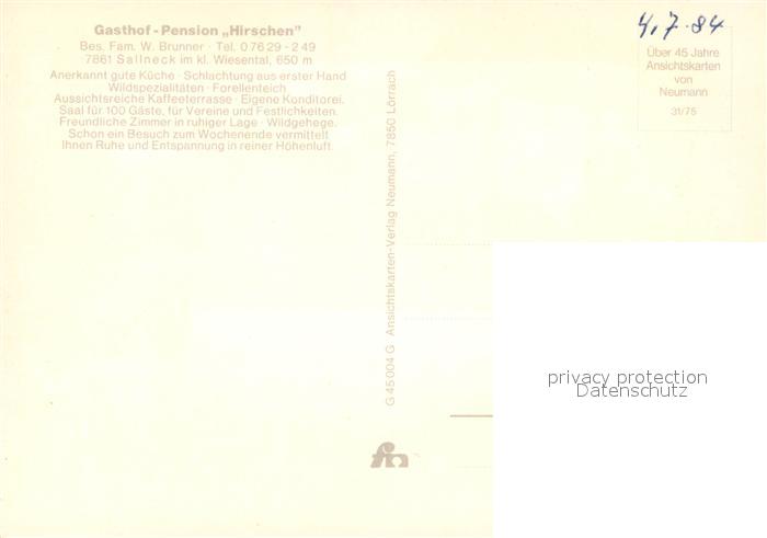 73599977 Sallneck Gasthof Hirschen Landschaftspanorama Kleines Wiesental Schwarzwald Rehe postalisch nicht gelaufen Erhaltung siehe scans [FriedD77] KatCode: 11110008336074