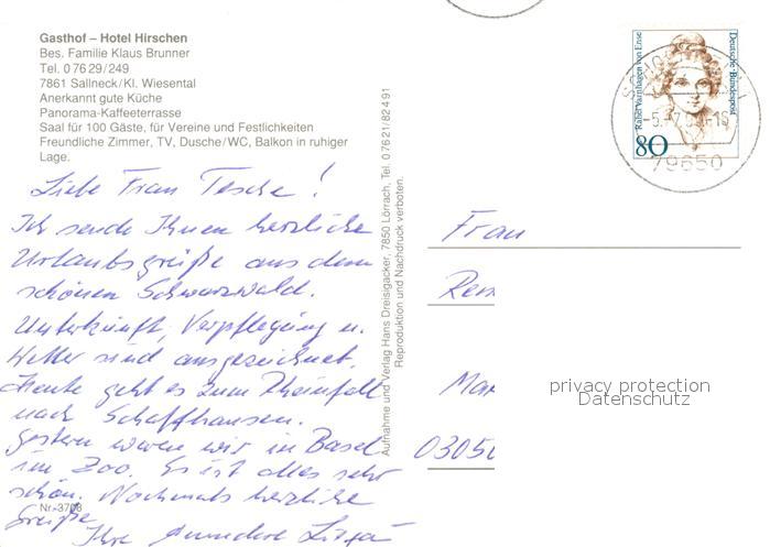 73599894 alte Postkarte Sallneck Gasthof Hotel Hirschen postalisch gelaufen Erhaltung siehe scans [FriedD77] KatCode: 11110008336074