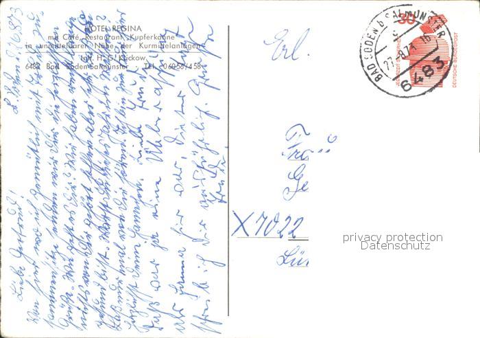 72367159 alte Postkarte Salmuenster Bad Soden Hotel Regina Cafe Restaurant Kupferkanne postalisch gelaufen Erhaltung siehe scans KatCode: 11110006436001
