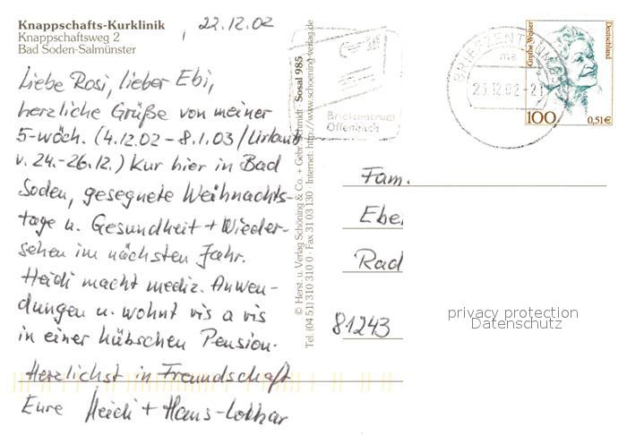 73173174 alte Postkarte Salmuenster Bad Soden Knappschafts-Kurklinik postalisch gelaufen Erhaltung siehe scans [LiesaD40] KatCode: 11110006436001