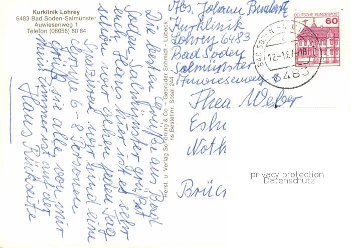 72916390 alte Postkarte Salmuenster Bad Soden Kurklinik Lohrey Auwiesenweg postalisch gelaufen Erhaltung siehe scans [LiesaD40] KatCode: 11110006436001