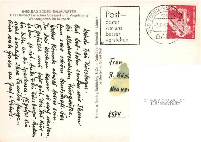 72785208 alte Postkarte Salmuenster Bad Soden Wassergarten im Kurpark Kurhaeuser Heilbad postalisch gelaufen Erhaltung siehe scans [FriedD77] KatCode: 11110006436001