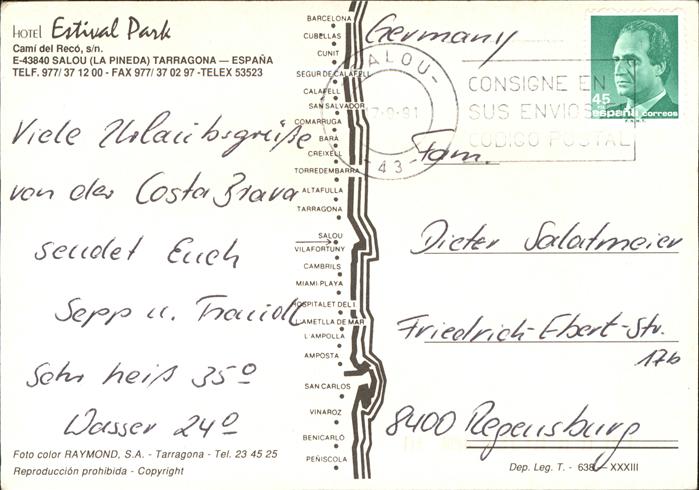 old postcard Salou Hotel Estival Park Simming Pool postalisch gelaufen Erhaltung siehe scans