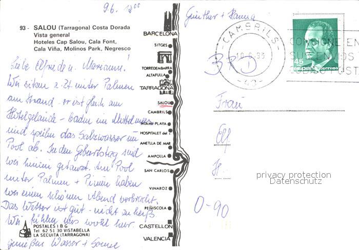 old postcard Salou Vista aerea Hoteles Cap Salou Cala Font Cala Vina Molinos Park Negresco postalisch gelaufen Erhaltung siehe scans