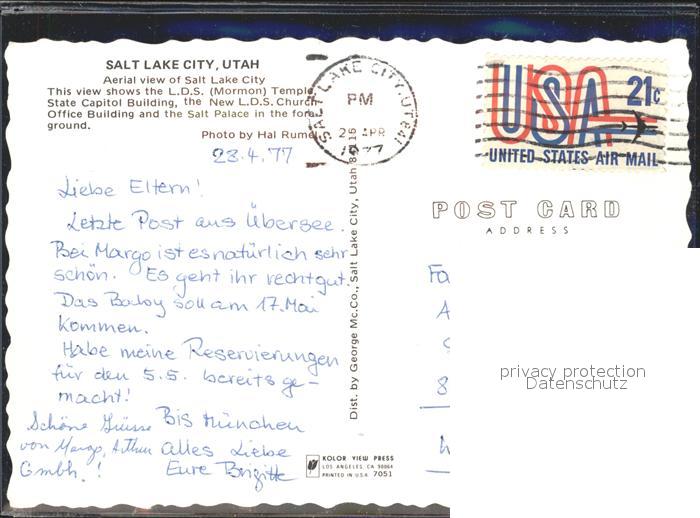 72132493 old postcard Salt Lake City Mormon Temple State Capitol Building Church Office Building and the Salt Palace Air view postalisch gelaufen Erhaltung siehe scans KatCode: 14140470000000