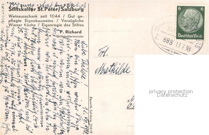 13527511 SALZBURG AT Stiftskeller St Peter postalisch gelaufen Bahnpost Erhaltung siehe scans [WerneD78] Bahnpost alte Postkarte Wern Katcode 11390323050101