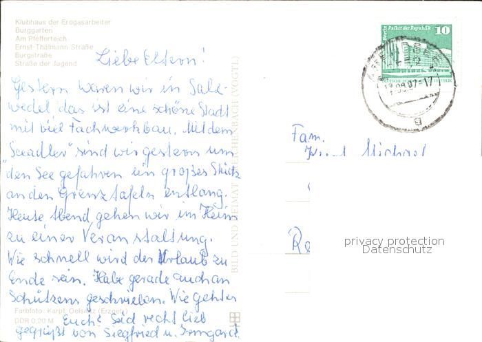 72416982 alte Postkarte Salzwedel Klubhaus der Erdgasarbeiter Burggarten am Pfefferteich Ernst-Thaelmann-Strasse Burgstrasse Strasse der Jugend postalisch gelaufen Erhaltung siehe scans KatCode: 11110015081455