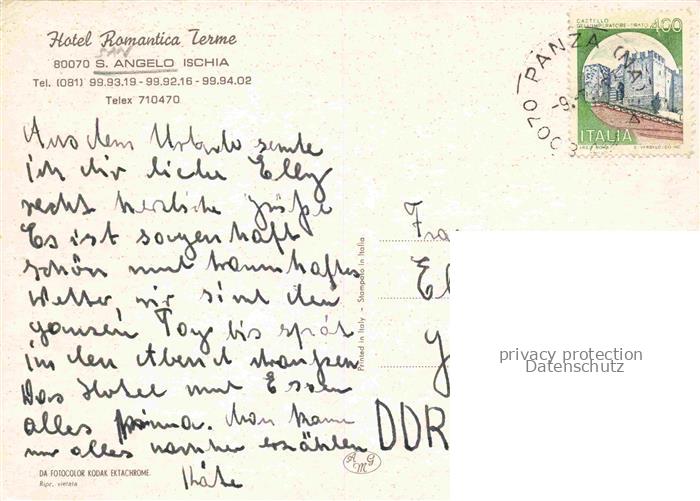 74111008 old postcard San Angelo Ischia Napoli Campania IT Hotel Romantica Terme Gastraeume Tennisplatz postalisch gelaufen Erhaltung siehe scans [WerneD78] KatCode: 11240