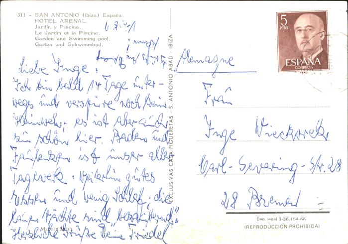 old postcard San Antonio Sant Antoni de Portmany Hotel Arenal Jardin Piscina Garten und Schwimmbad postalisch gelaufen Erhaltung siehe scans