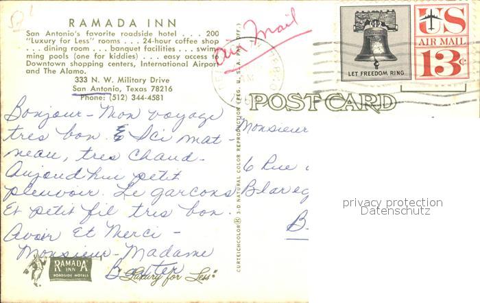 71953235 old postcard San Antonio Texas Hotel Ramada Inn postalisch gelaufen Erhaltung siehe scans KatCode: 14140460000000