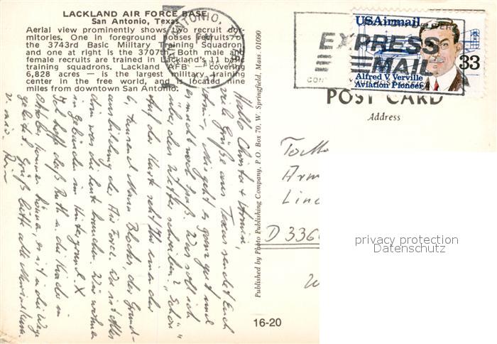 13222395 old postcard San Antonio Texas Lackland Air Force Base aerial view postalisch gelaufen Erhaltung siehe scans [FriedD77] KatCode: 14140460000000