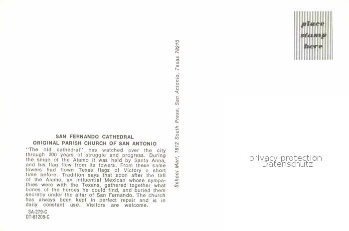 72706940 San Antonio Texas San Fernando Cathedral postalisch nicht gelaufen Erhaltung siehe scans [AndreD76] KatCode: 14140460000000