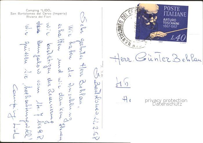old postcard San Bartolomeo al Mare Camping Lido Spiaggia Riviera dei Fiori postalisch gelaufen Erhaltung siehe scans