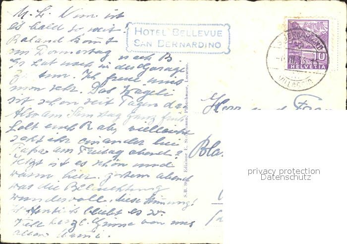 11651326 alte Postkarte San Bernardino Hinterrhein Hotel Bellevue postalisch gelaufen Erhaltung siehe scans KatCode: 11470360700048