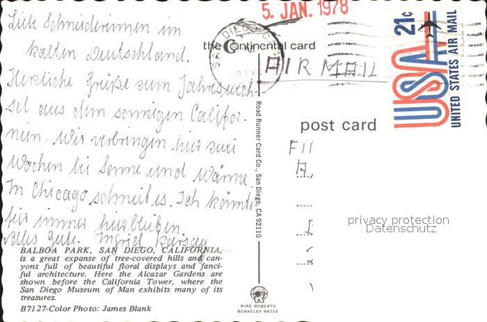 72479414 old postcard San Diego California Balboa Park postalisch gelaufen Erhaltung siehe scans KatCode: 14140050000000