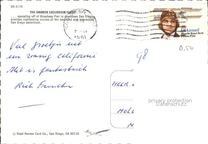 72451051 old postcard San Diego California Hafen postalisch gelaufen Erhaltung siehe scans KatCode: 14140050000000