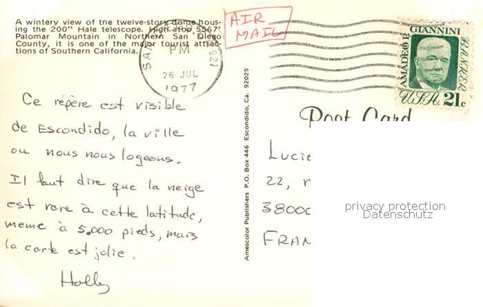 72944249 old postcard San Diego California Hale telescope postalisch gelaufen Erhaltung siehe scans [WerneD78] KatCode: 14140050000000