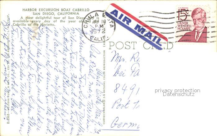 72152294 old postcard San Diego California Harbor Excursion Boat Cabrillo postalisch gelaufen Erhaltung siehe scans KatCode: 14140050000000