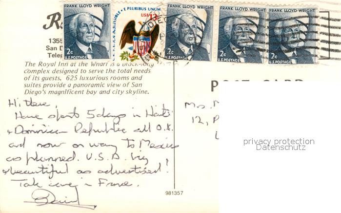 73131749 old postcard San Diego California Royal Inn at the Wharf postalisch gelaufen Erhaltung siehe scans [FriedD77] KatCode: 14140050000000