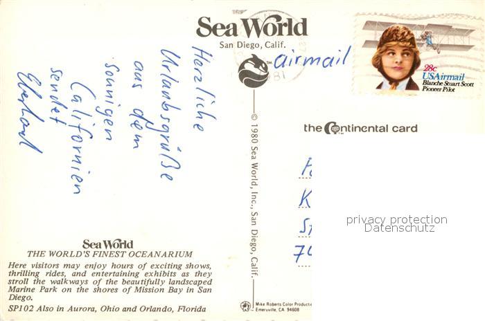 73005092 old postcard San Diego California Sea World Oceanarium Fliegeraufnahme postalisch gelaufen Erhaltung siehe scans [WerneD78] KatCode: 14140050000000