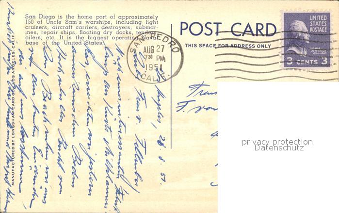 11686200 old postcard San Diego California US Battleship postalisch gelaufen Erhaltung siehe scans KatCode: 14140050000000
