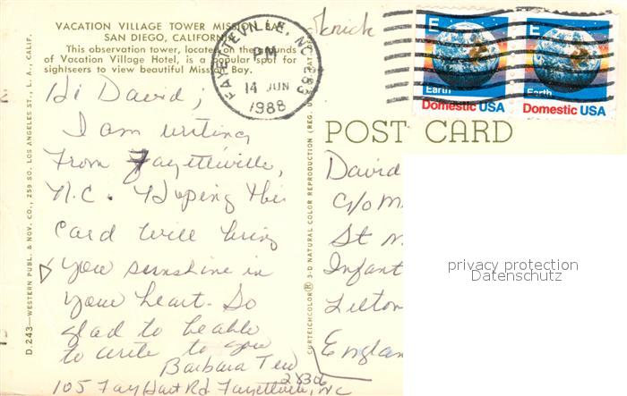 73130583 old postcard San Diego California Vacation Village Tower Mission postalisch gelaufen Erhaltung siehe scans [KathaD81] KatCode: 14140050000000
