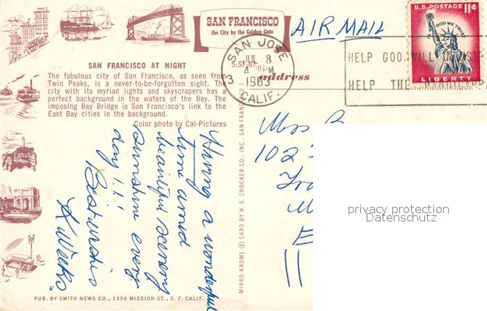 73131812 old postcard San Francisco California At night aerial view postalisch gelaufen Erhaltung siehe scans [FriedD77] KatCode: 14140050000000