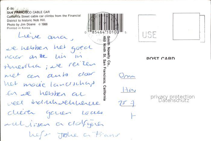 72581878 old postcard San Francisco California Cable Car postalisch gelaufen Erhaltung siehe scans [LiesaD40] KatCode: 14140050000000